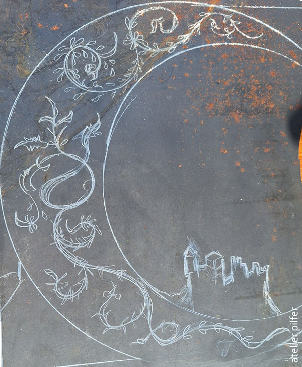 Inspiration Lune, entrelacs végétaux et silhouettes des Tours de Merle en Xaintrie (Collection privée)